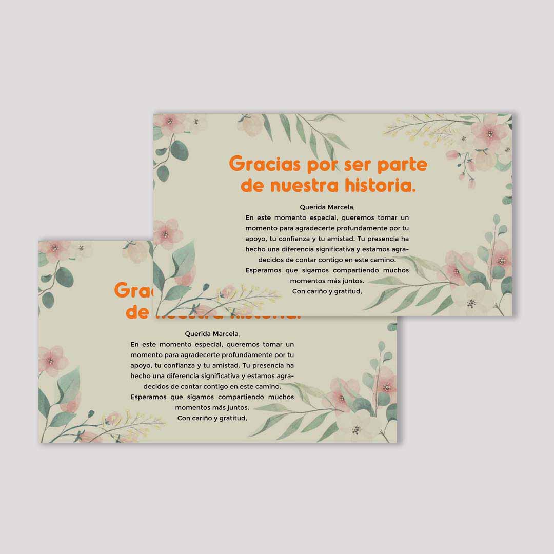 Diseñamos tarjetas con un enfoque completamente personalizado. Puedes incluir tu logo, colores corporativos, frases inspiradoras o incluso mensajes escritos a mano. Por lo tanto, se convierte en una extensión coherente de tu marca.